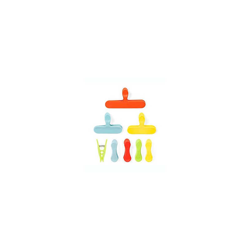 Pinzas para bolsas Simply Essential™ Rainbow mantendrán tus alimentos frescos para que puedas disfrutar de su delicioso sabor por más tiempo.8 pinzas de diferentes coloresCierra bolsas de alimentos, como pretzels, frituras o verduras congeladasIncluye:1 pinza grande2 pinzas medianas5 pinzas chicasPlástico ABSMedidas: 2.54 cm de largo, 6.35 cm de ancho y 3.04 cm de altoPeso: 22.67 gDe importación